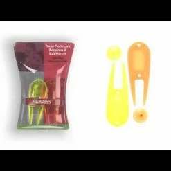 A pack of 2 divot repair tools and 2 ball markers. Made in bright neon colours to ensure that both the pitchmark repairers and ball markers are easy to find.
