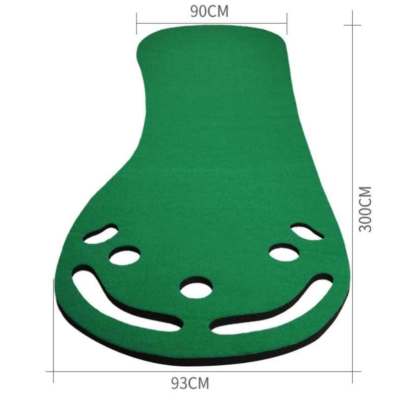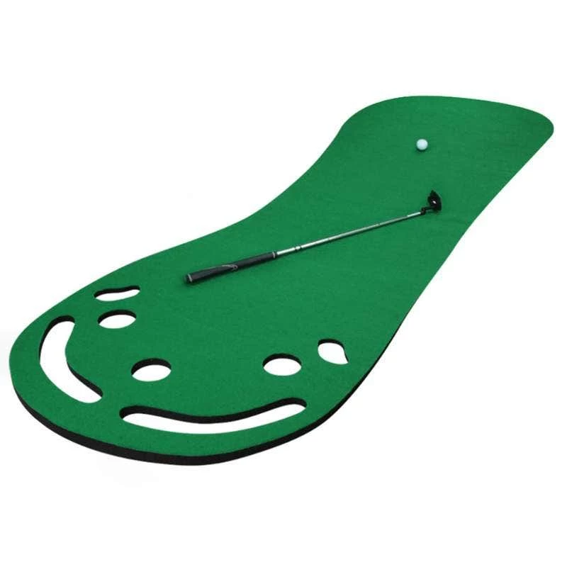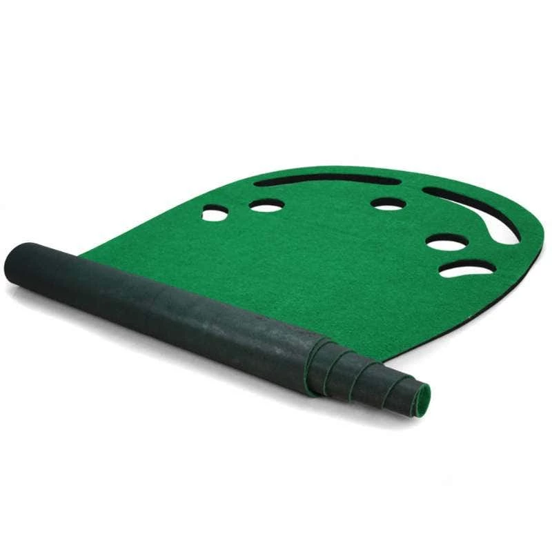 Simulates the slope design of the green so you can practice golf putting at home all year round. Store it easily by rolling it up and putting it away when not in use, and set it up in seconds to enjoy a round of putting whenever and wherever you please. The top-quality artificial grass boasts an 8mm height that mimics the feel of a real course. The mat has 3 holes so you can practice and train different putting techniques.